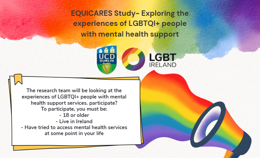 LGBT Ireland and UCD are seeking research participants for the Irish contribution of a European project on improving mental health access. The Equicares Project is exploring real-life barriers that people face when trying to access support and how we can work together to build more inclusive, effective mental health systems.